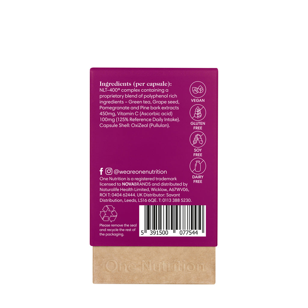 (per capsule): NLT-400® complex containing a proprietary blend of polyphenol rich ingredients – Green tea, Grape seed, Pomegranate and Pine bark extracts 450mg, Vitamin C (Ascorbic acid) 100mg (125% Reference Daily Intake). Capsule Shell: OxiZeal (Pullulan).
