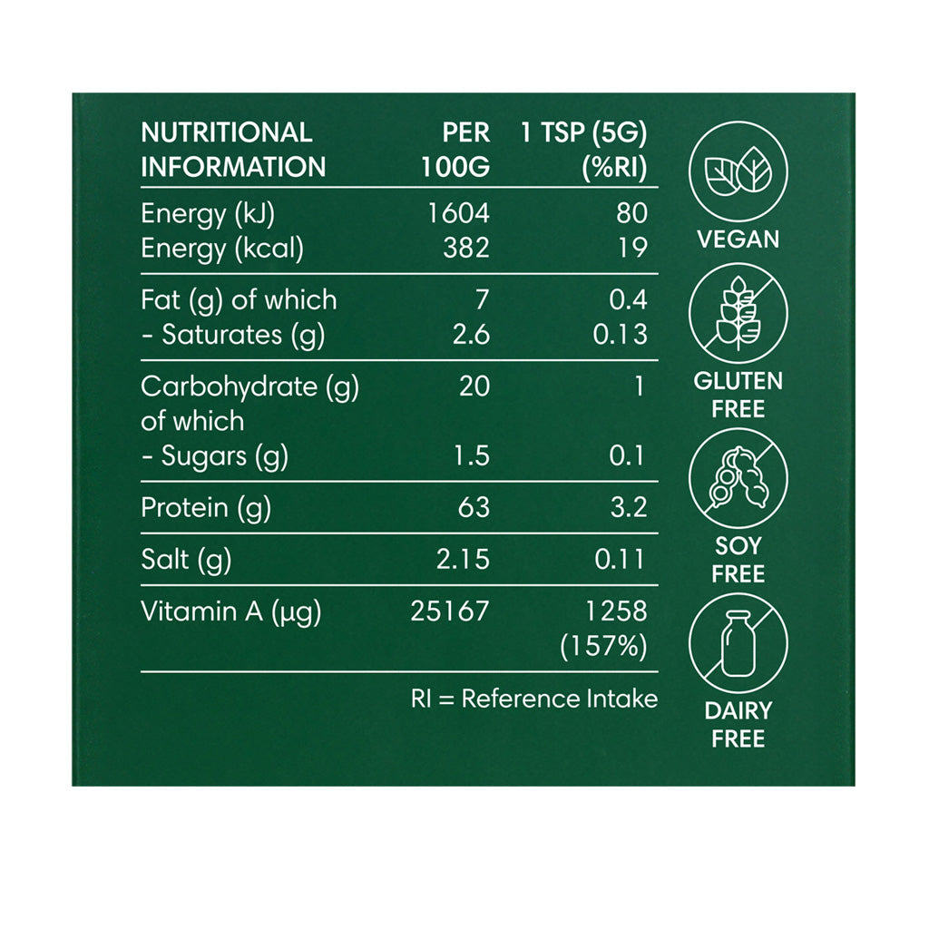 Bursting with more green goodness than you think, with nutrients including: calcium, niacin, potassium, magnesium, B vitamins, and iron, as well as high antioxidant levels. Spirulina can be mixed with water, juices, smoothies, protein drinks and added to porridge