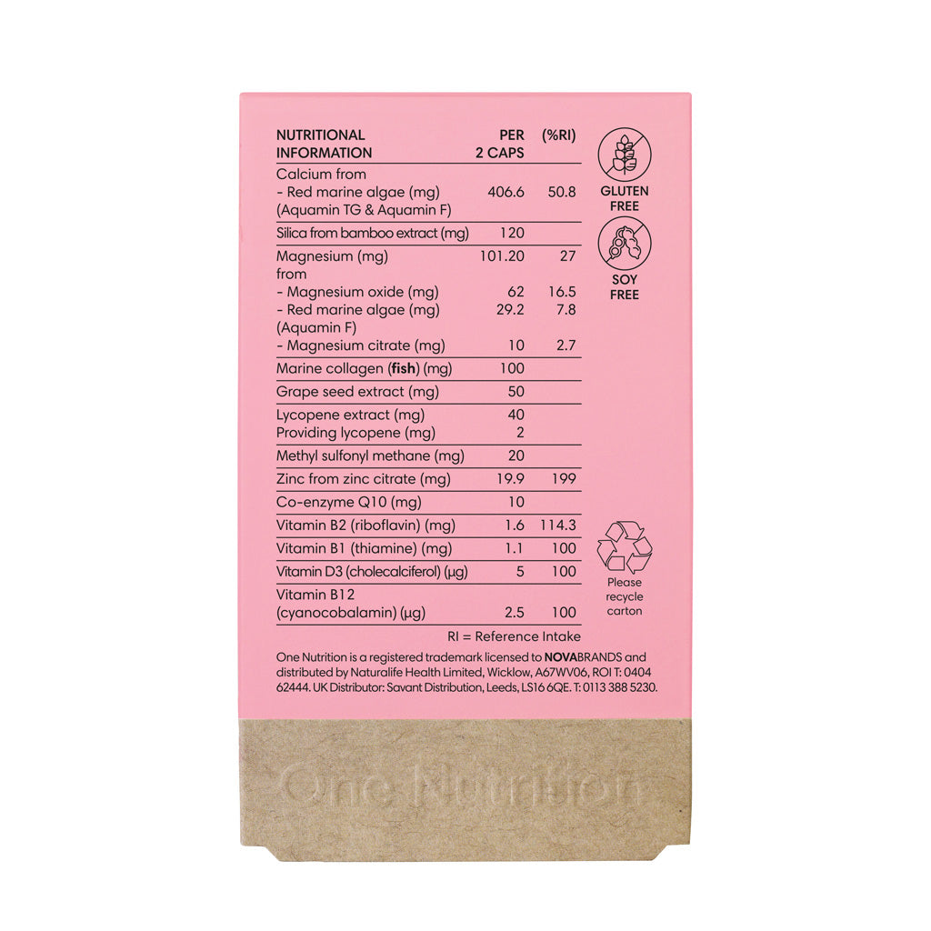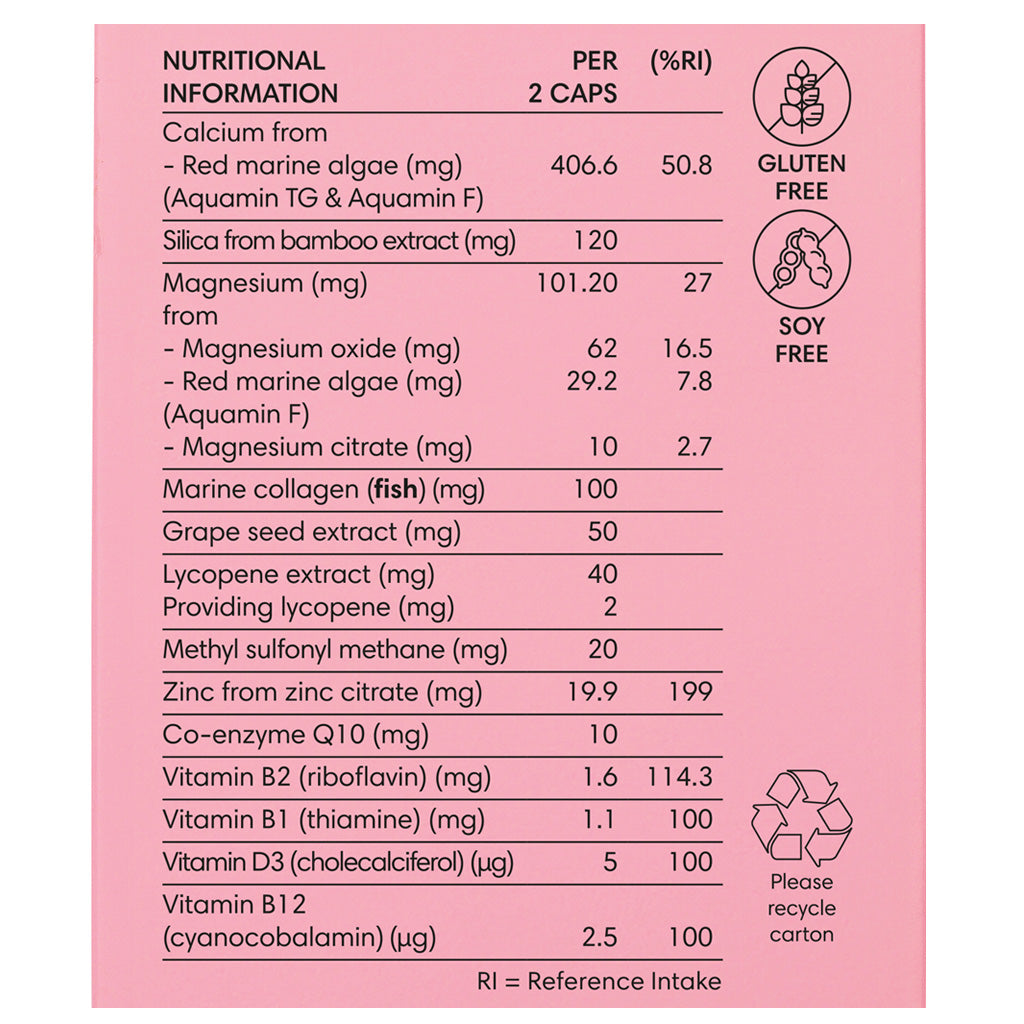 Red marine algae, Silica from bamboo extract, Marine collagen (fish), Magnesium oxide, Grape seed extract, Lycopene extract, Methyl sulfonyl methane, Zinc citrate, Magnesium citrate, Co-enzyme Q10, Vitamin B2 (riboflavin), Vitamin B1 (thiamine), Vitamin D3 (cholecalciferol), Vitamin B12 (cyanocobalamin). Capsule shell: Pullulan (vegetarian). For allergens see ingredients in bold.